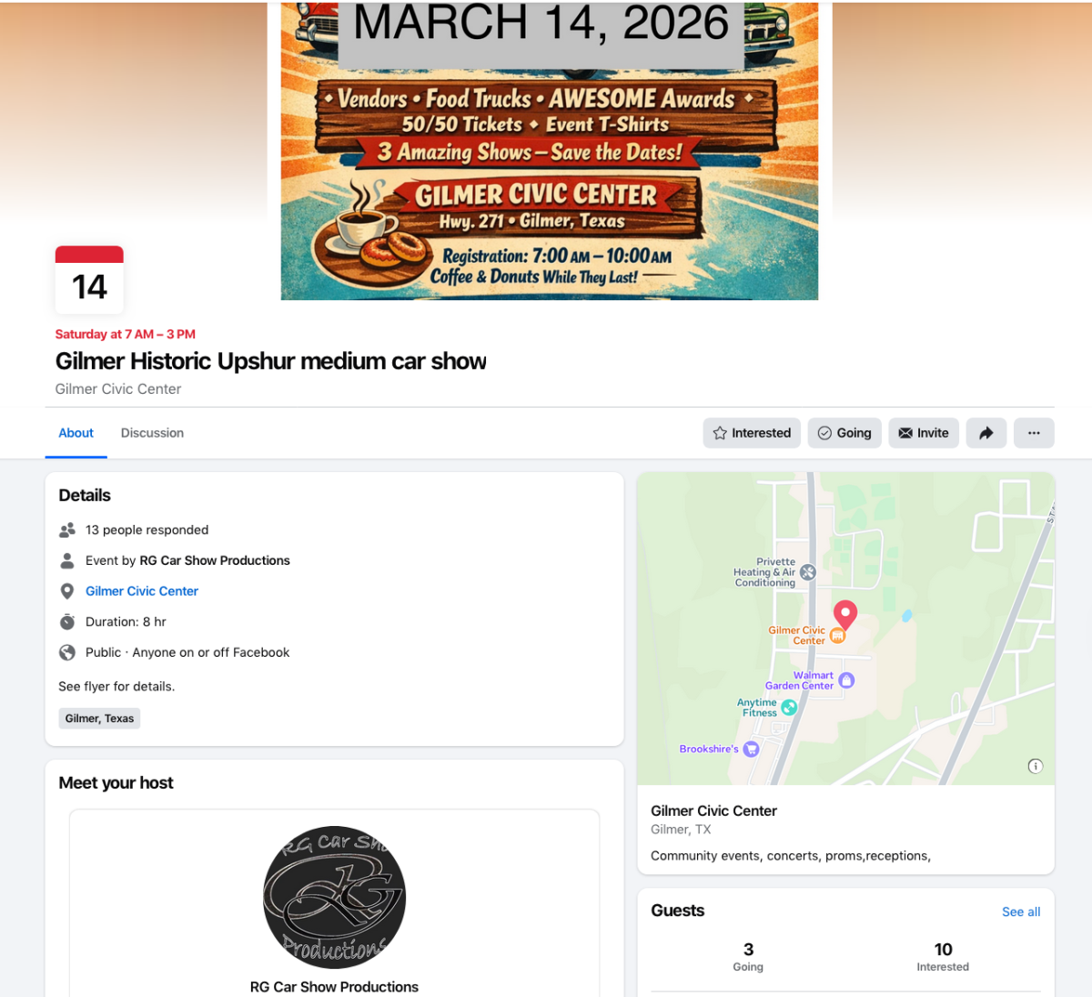 Historic Upshur Museum hosting car show at Gilmer Civic Center Saturday, March 14 By Editor | March 11, 2026 | 2 Posted in Breaking News, News 2 Comments CHRISTOPHER SHELTON on March 14, 2026 at 5:30 pm GILMER MIRROR Reply CHRISTOPHER SHELTON on March 14, 2026 at 5:31 pm GILMER TEXASS MIRROR Reply Leave a Comment Name (required) Email (will not be published) (required) Comment Click here to cancel reply. Related Posts Historic Upshur Museum hosting Vintage Fashion Show on April 11 at Upshur Rural Auditorium March 31, 2026 | No Comments » Texas Weekly Gas Price Update March 30, 2026 | No Comments » JIM “PAPPY” MOORE: Harry Whitworth’s Sage Advice March 29, 2026 | No Comments » Texas suburbs lead U.S. for population growth as international migration slows, census finds March 26, 2026 | No Comments » Texas A&M Forest Service urges continued wildfire awareness as warm, dry conditions persist across Texas March 24, 2026 | No Comments »