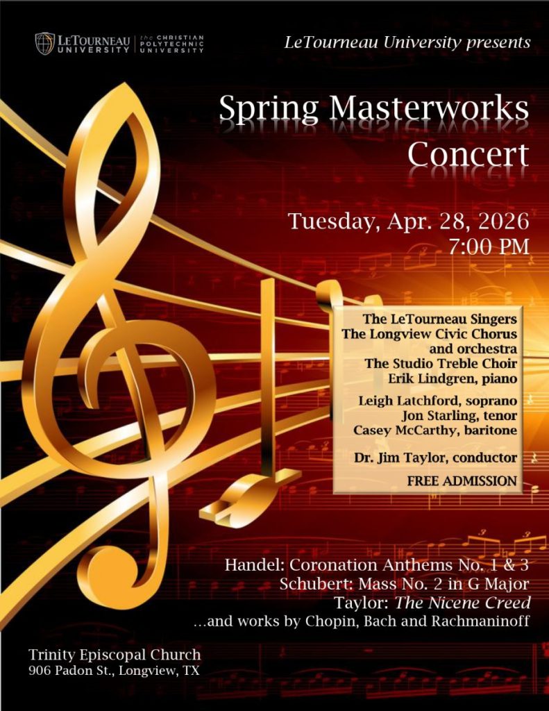 LeTourneau University’s 2026 Spring Masterworks Concert will be held at Trinity Episcopal Church at 906 Padon St. in Longview on Tuesday, April 28 at 7:00 p.m. Dr. Jim Taylor, Director of Fine Arts at LeTourneau, will direct the LeTourneau Singers and the Longview Civic Chorus and orchestra, with guest soloists soprano Leigh Latchford, tenor Jon Starling, and baritone Casey McCarthy.
